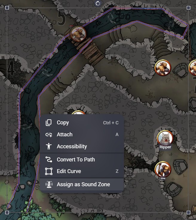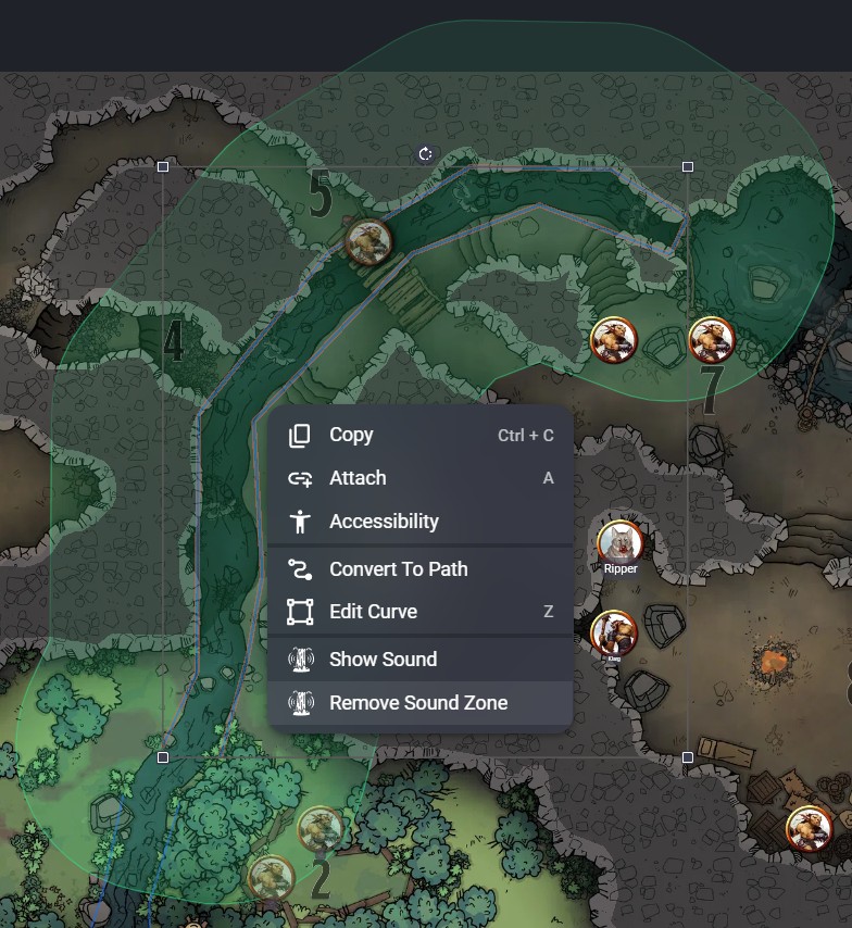 Where a circular emitter places a point source with a radius, a Sound Zone uses a polygon you've already drawn on the map. Listener tokens inside the polygon hear full volume, listeners outside will hear the audio fade over a configurable Fade distance as they move away from the polygon's edge.