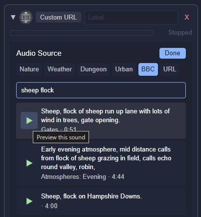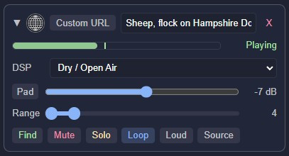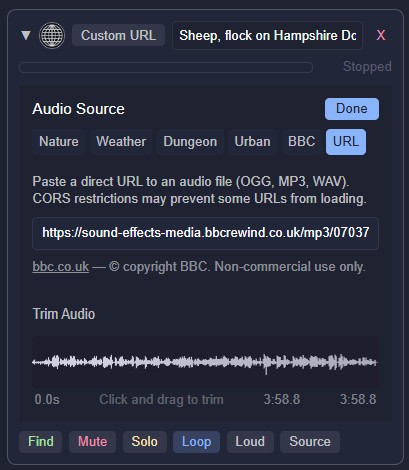 CORS note: The remote server must allow cross-origin requests. If a URL fails to load, it is almost always a CORS restriction on the server side, not a Murmur issue. Freesound preview and BBC Sound Effects URLs are known to work.