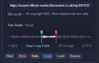 URL emitters (both BBC and user-provided URLs) support waveform trimming - a visual editor that lets you define exactly which portion of the audio file will play.