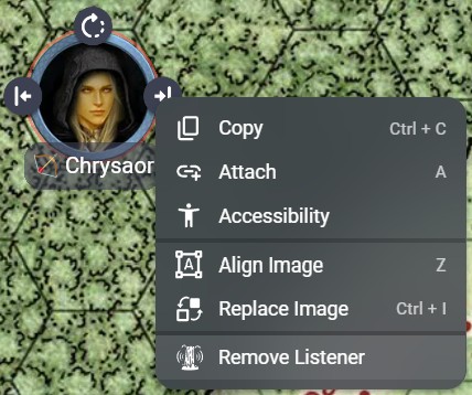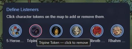Within this popover, clicking on any Character-layer tokens within the Scene will toggle them into/out of this list, and you can also cancel an existing listener definition by clicking on any token in this pool to remove it - if you hover over a token you'll see it gets a red halo and a tooltip confirming what will happen if it is selected: