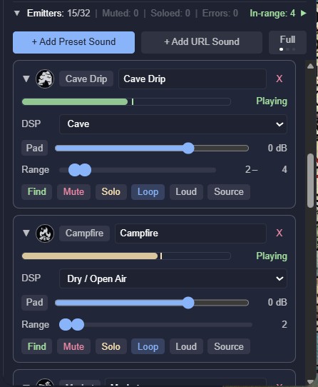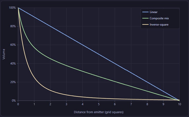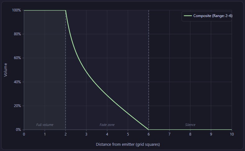 - Attenuates by distance - volume falls off naturally based on how far the player's token is from the emitter