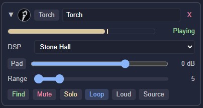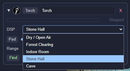 Each preset also comes with a sensible default DSP - Cave Drip defaults to the Cave reverb, Torch to Stone Hall, Market to Indoor Room - so they sound right straight out of the box.