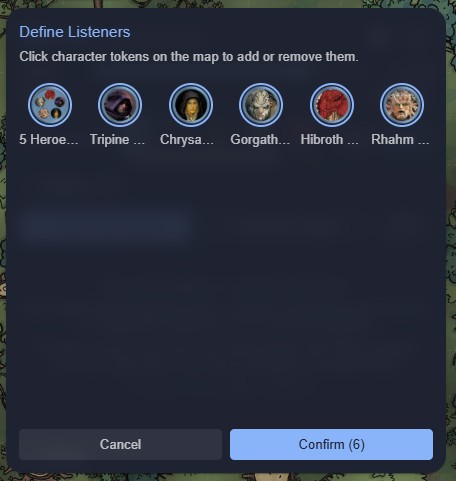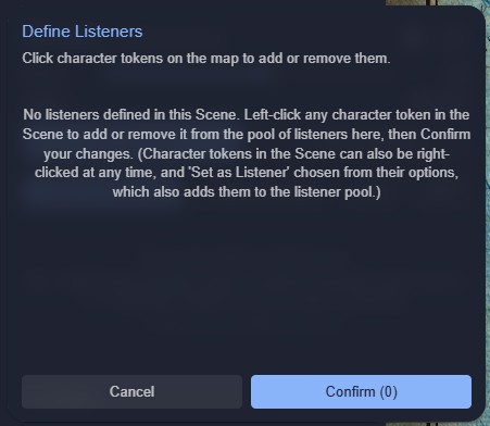 The + Add Listeners button will produce a popover with instructions inside it - while this is open you can select any Character-layer tokens in the Scene to add (or remove) them from this pool of listener candidates, and then Cancel or Confirm your changes with the buttons at the foot of the popover: