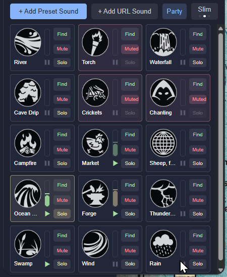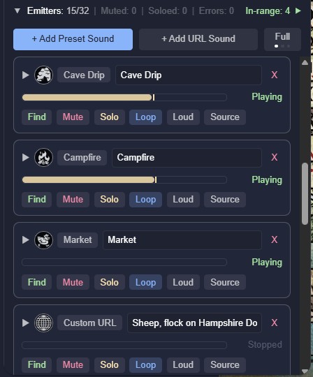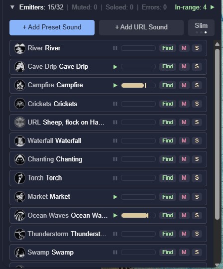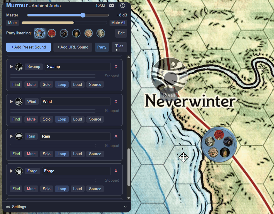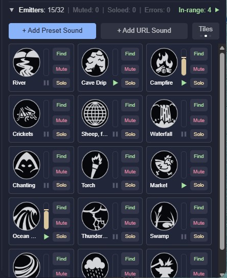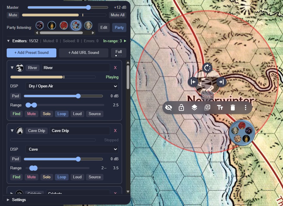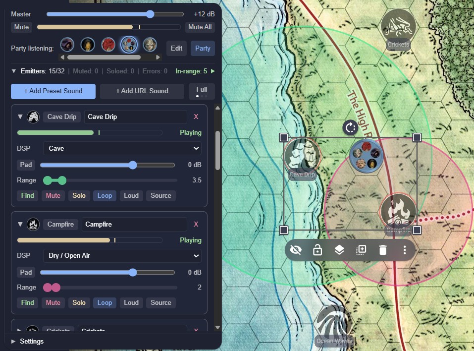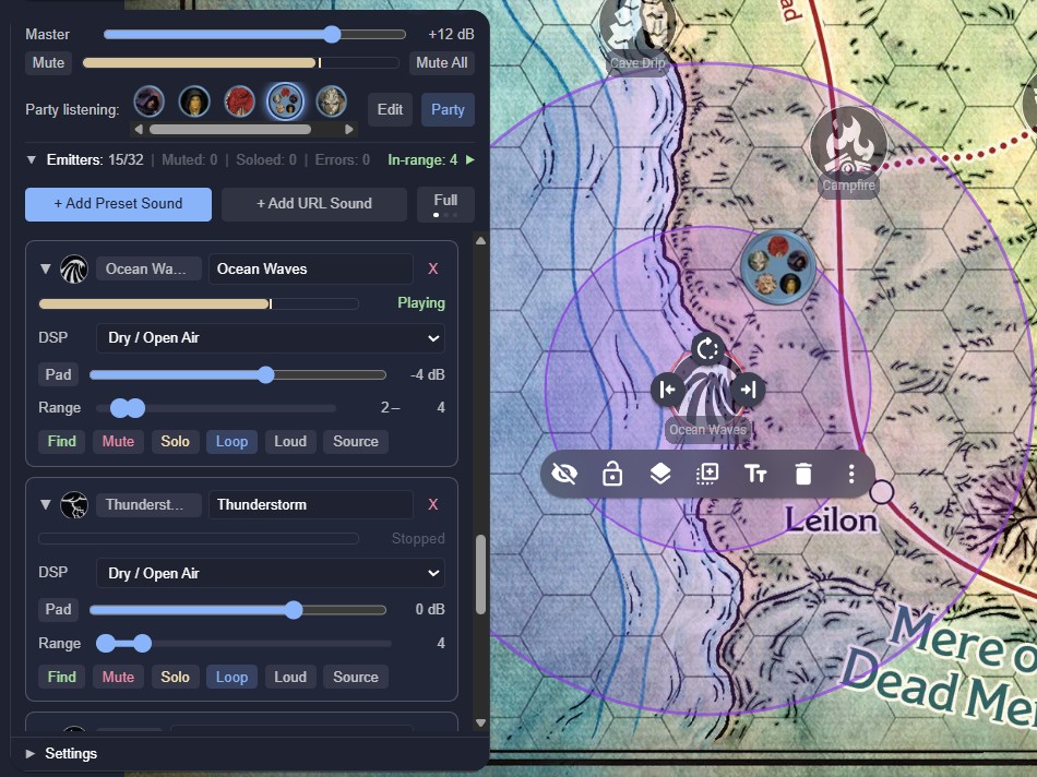 A player standing next to a waterfall hears it roar. A player across the map hears a distant rumble, or nothing at all. The same torch crackle sounds intimate in a stone hall, muffled in a forest, and reverberant in a cave. Multiple emitters co-exist independently; a forge hammering in one corner, crowd chatter in another, rain on the roof overhead. In Player mode, each person hears the world from their character's position, not the GM's; no two players hear the same mix. In Party mode, worldmap navigation is simplified, because all the players hear the same things as their characters travel together