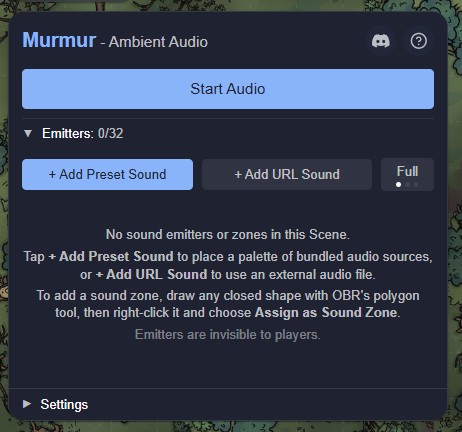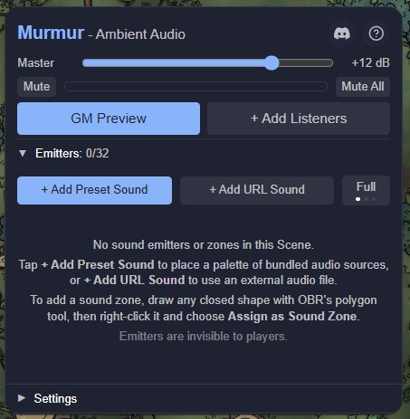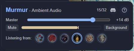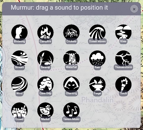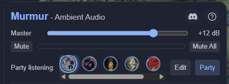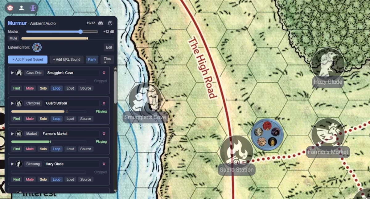 Murmur is an Owlbear Rodeo extension that lets the GM place invisible audio emitters on the map. Each emitter plays ambient sound - a crackling campfire, dripping cave water, a bustling market - and the volume fades naturally as a player's token moves closer or further away. Environmental digital signal processing (DSP) presets make the same campfire sound completely different in a cave versus a forest clearing.
