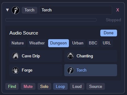 Initially this will show the current type and sound of this emitter, here it the Torch preset from the Dungeon group, but you can select any of the other presets from any of the other groups (Nature, Weather, and so on).