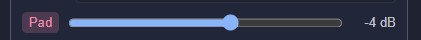 - Pad attenuator for loud sources, audio level slider with numeric readout